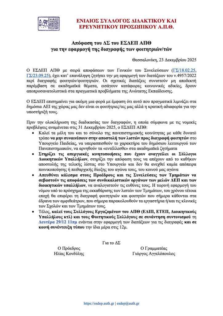 «Αυτό που πραγματικά λιμνάζει στα δημόσια ΑΕΙ της χώρας μας δεν είναι οι φοιτήτριες/τες μας αλλά η κρατική αδιαφορία για την υποστήριξή τους» τόνισαν τα μέλη του Ενιαίου Συλλόγου Διδακτικού και Ερευνητικού Προσωπικού του ΑΠΘ, στο πλαίσιο συνέντευξης τύπου παραχωρήθηκε σήμερα, επ’ αφορμή της ολοκλήρωση της διαδικασίας των διαγραφών, η οποία σύμφωνα με τις νομικές προβλέψεις αναμένεται την Τετάρτη, 31 Δεκεμβρίου 2025.